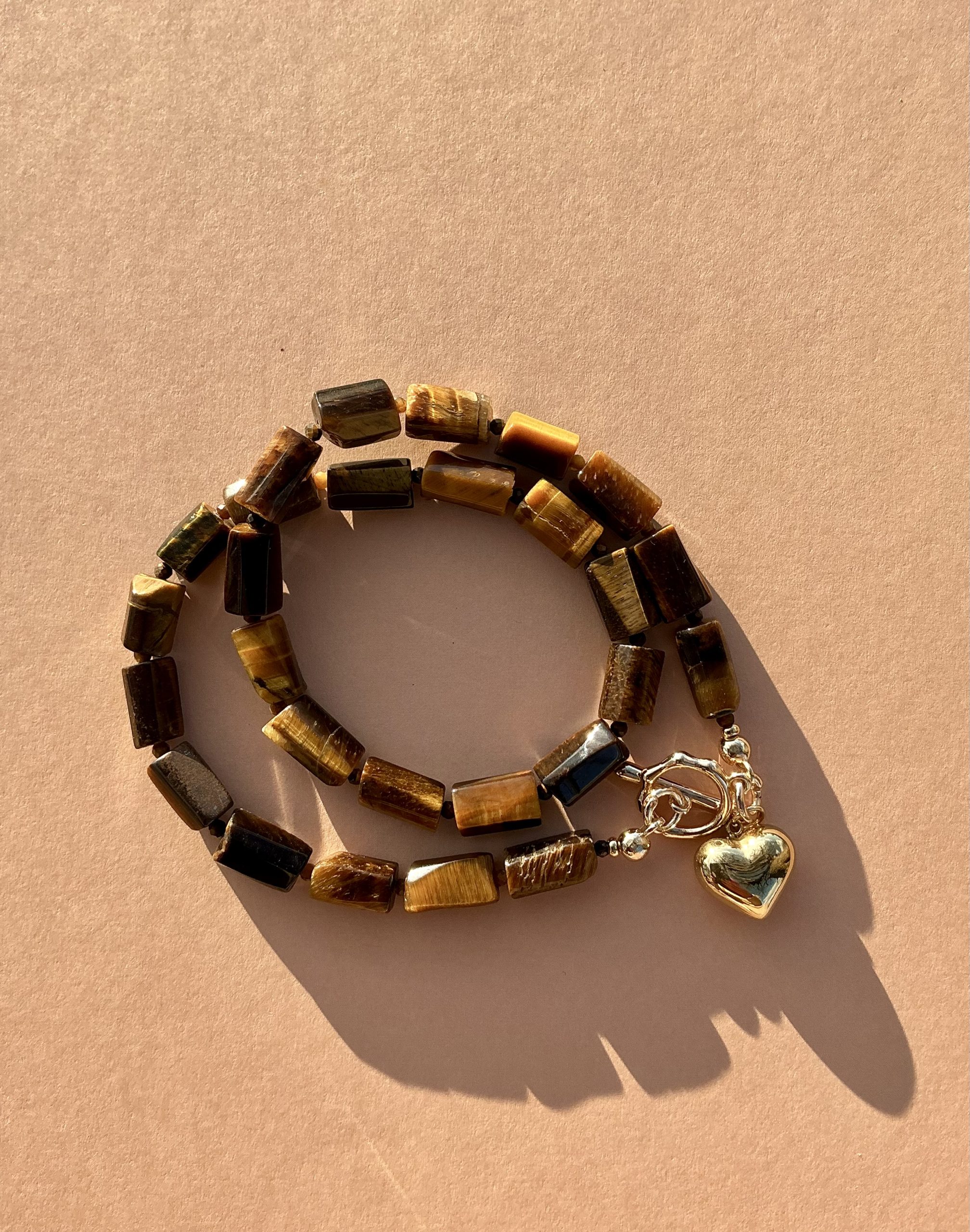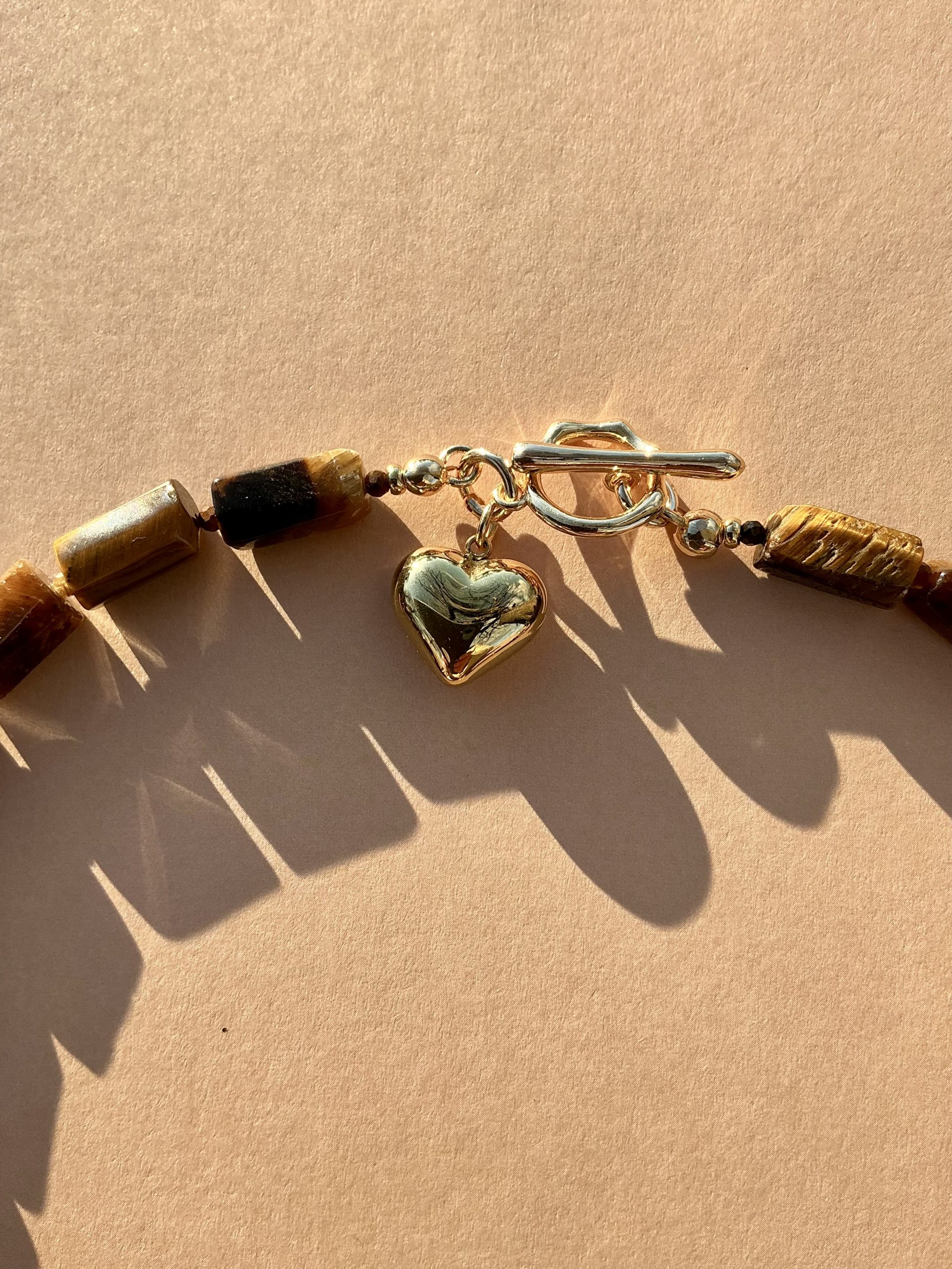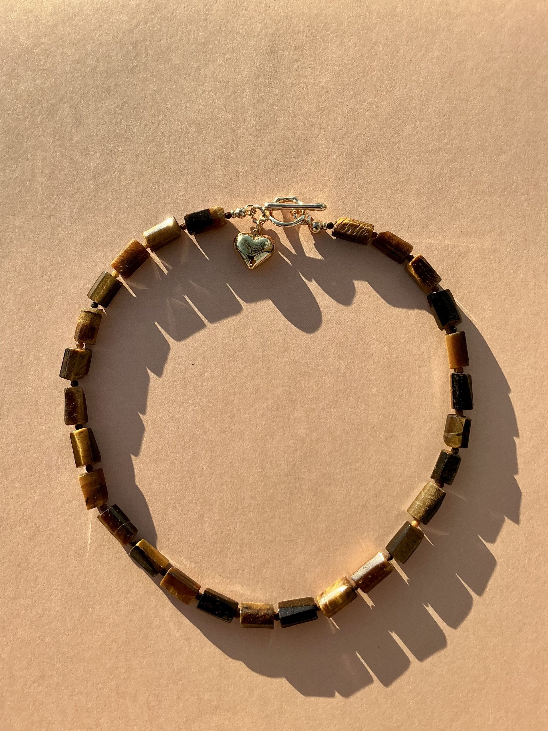 Elevate your everyday style with this handcrafted tiger’s eye necklace, featuring sleek rectangular beads that highlight the stone’s rich golden-brown glow. Finished with a polished gold toggle clasp and a delicate heart charm, this piece blends earthy elegance with a touch of warmth and femininity.