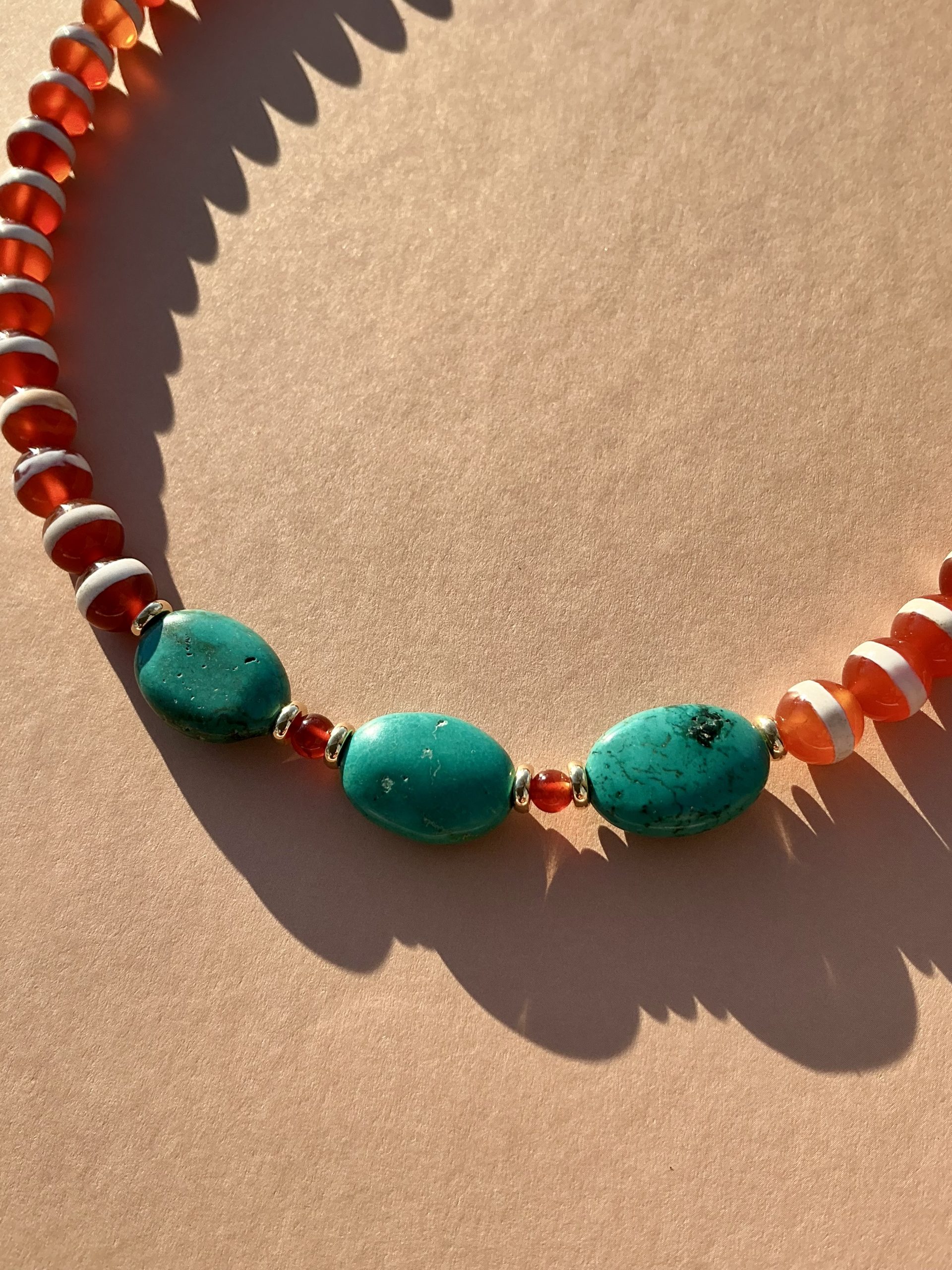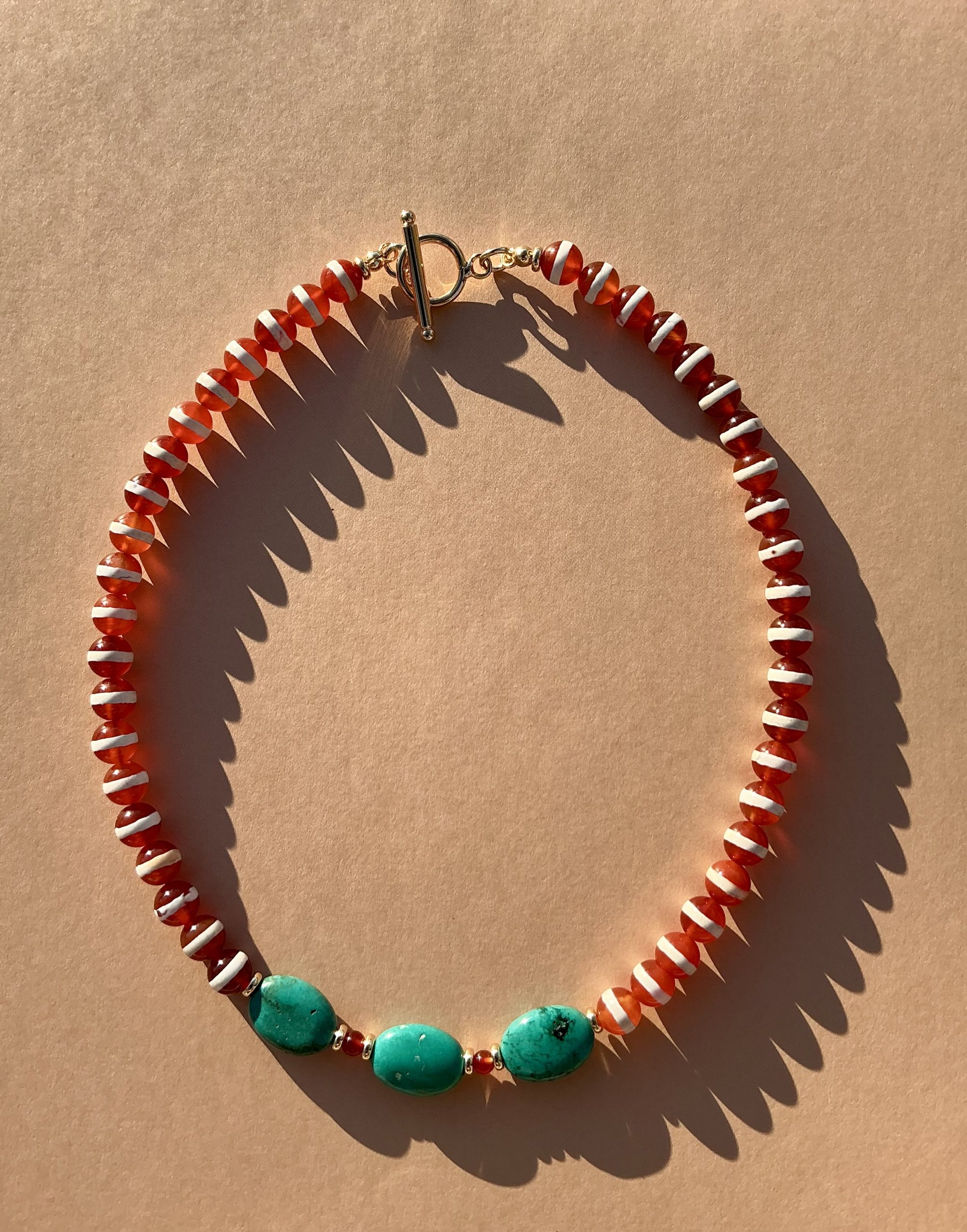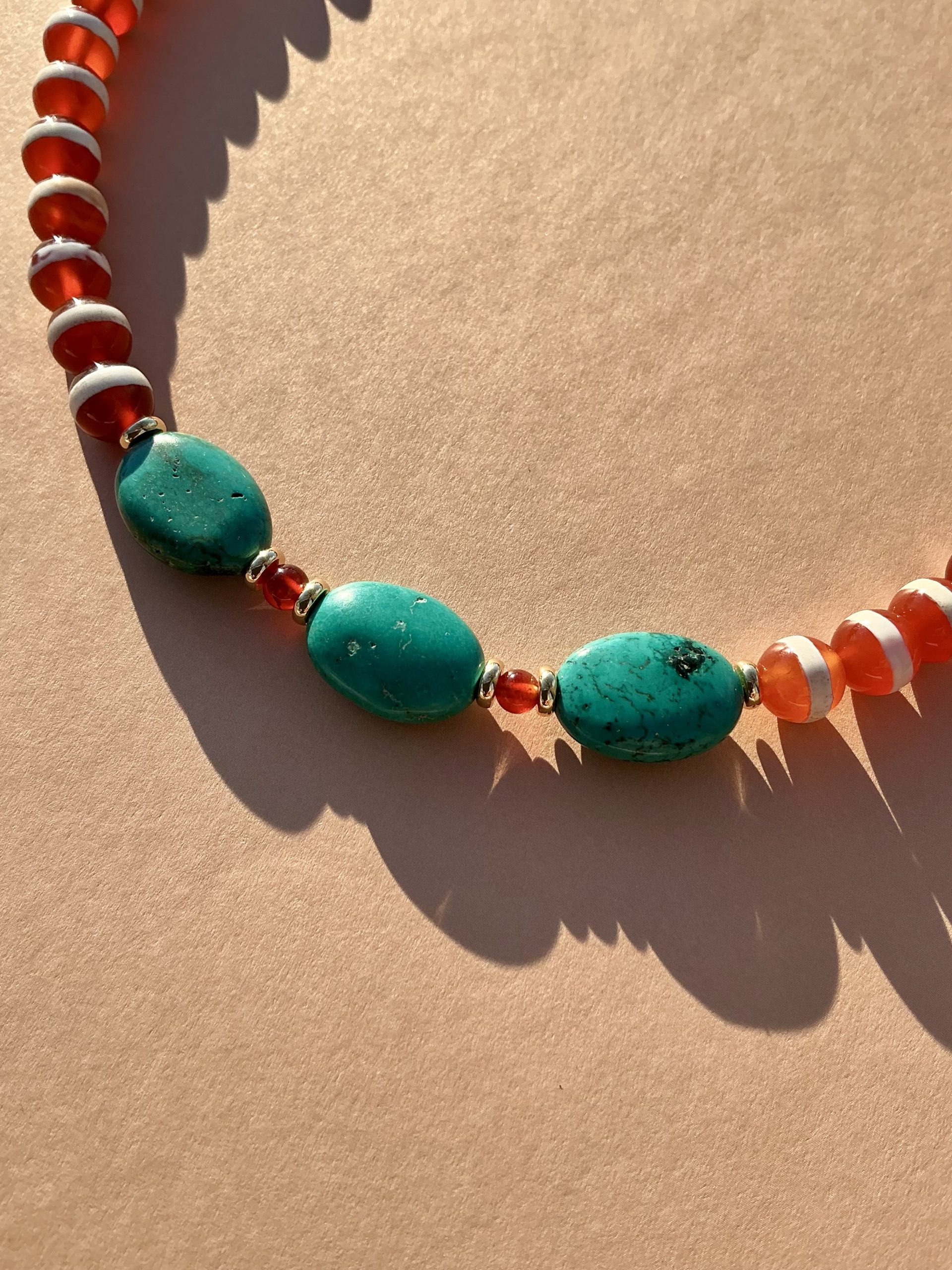 Discover the natural harmony of color and texture with this handcrafted striped agate necklace, beautifully finished with three turquoise gemstone drops. The unique banding patterns of striped agate create an earthy, grounded look, while the vibrant turquoise accents add a refreshing pop of blue that evokes calm, clarity, and effortless style.