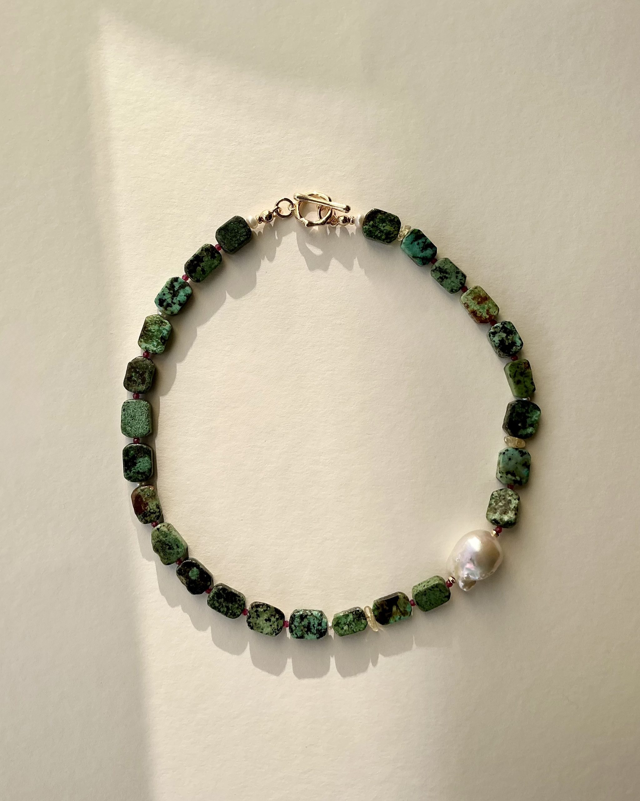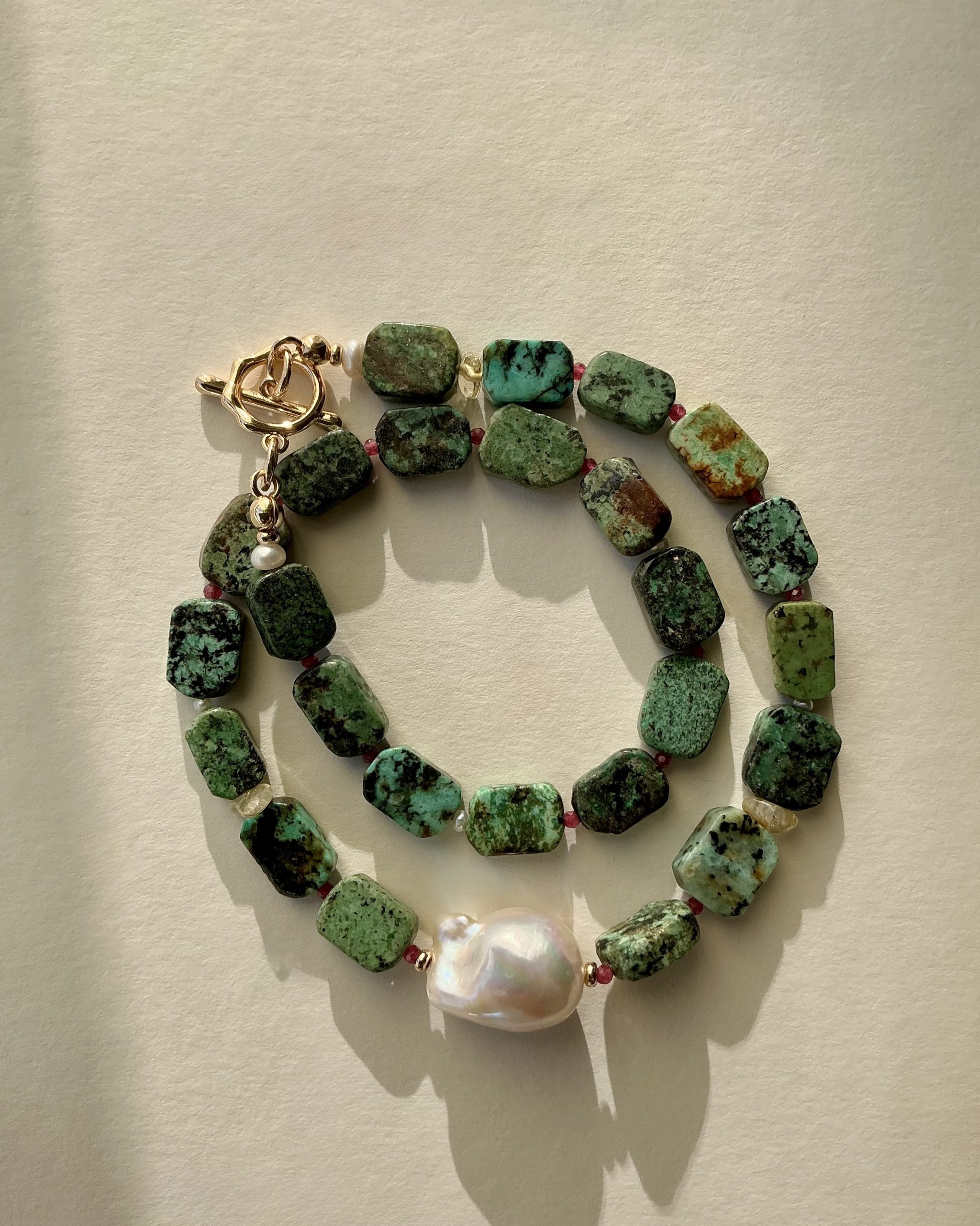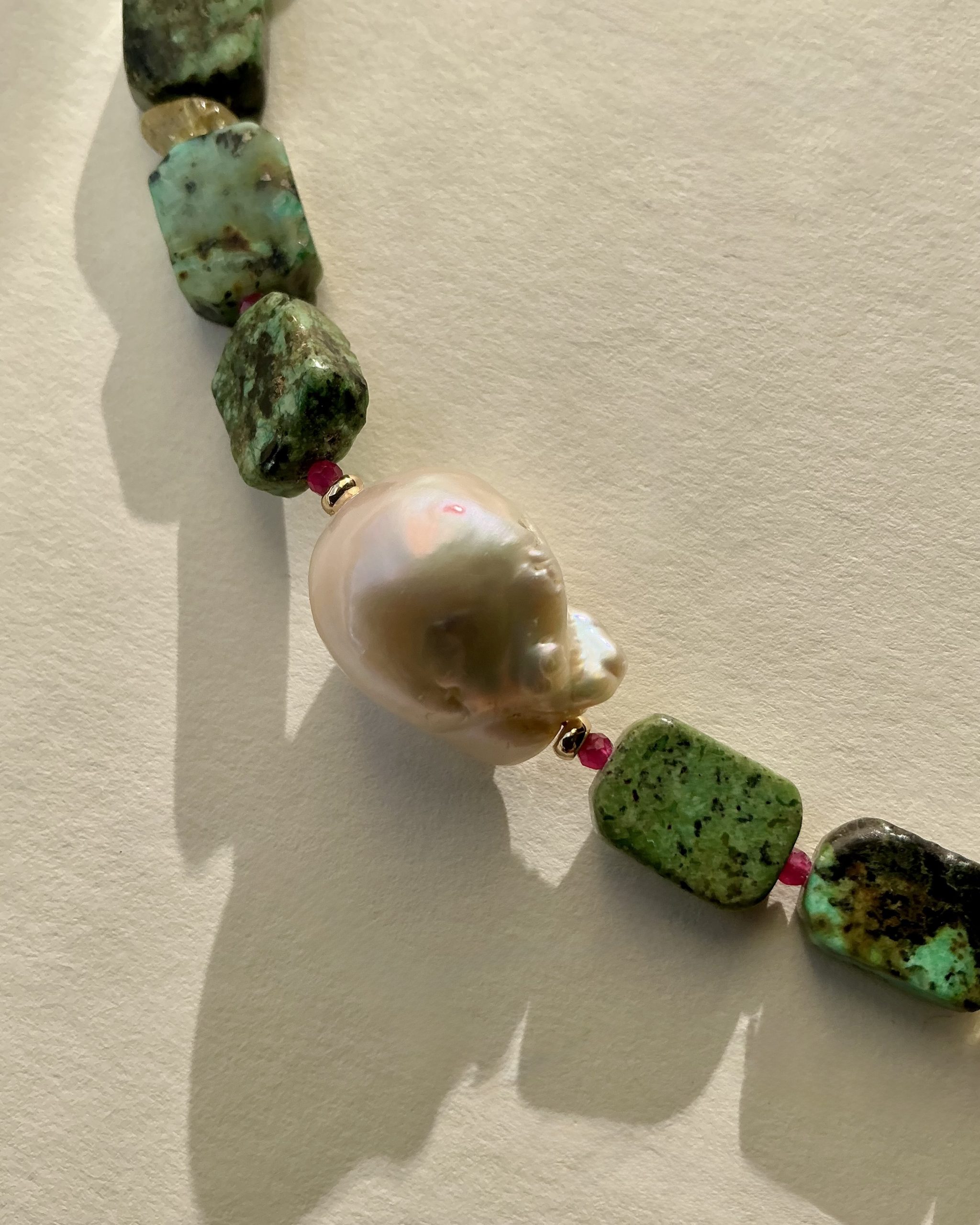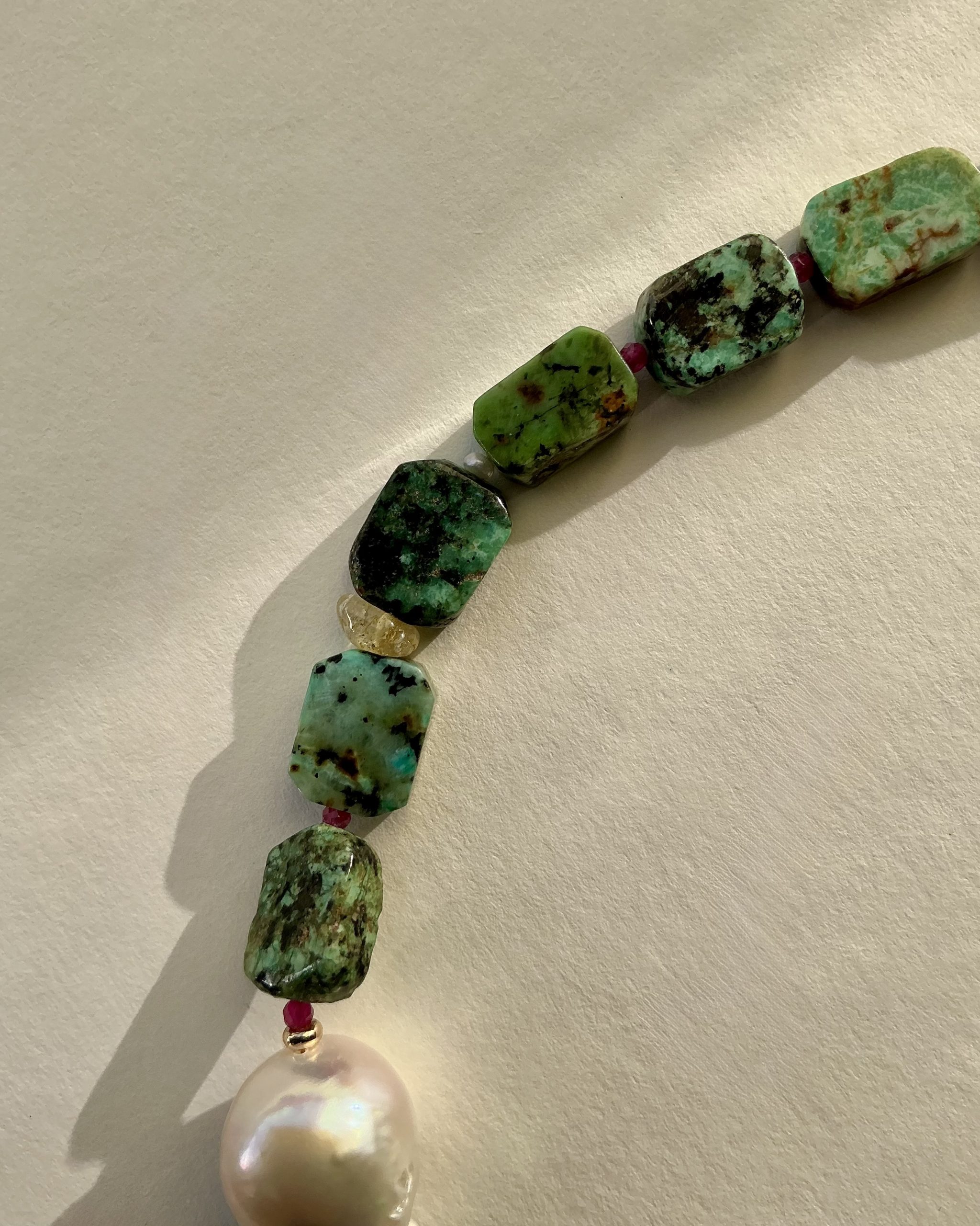 Bright, uplifting, and full of natural charm—this handcrafted necklace blends turquoise, a luminous baroque pearl, deep ruby accents, and warm citrine stones into one harmonious design. Each gemstone brings its own character, creating a vibrant yet elegant piece that feels both expressive and timeless.